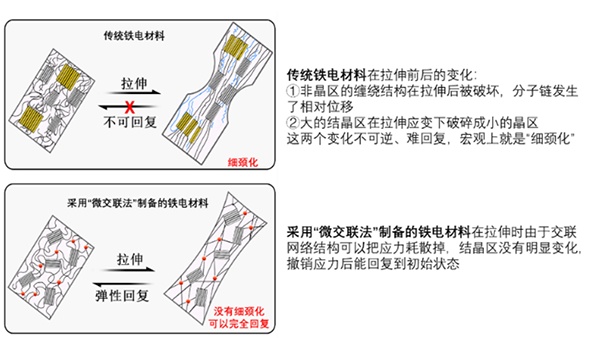 在国家自然科学基金项目资助下,中国科学院宁波材料技术与工程研究所李润伟研究员与胡本林研究员等率先研发出兼具弹性回复与铁电性的高分子材料,有效解决了传统铁电材料不具有大的弹性形变的难题,填补了弹性铁电材料领域的空白。相关工作以“精确微交联法实现聚合物铁电材料弹性化(Intrinsically elastic polymer ferroelectric by precise slight crossl